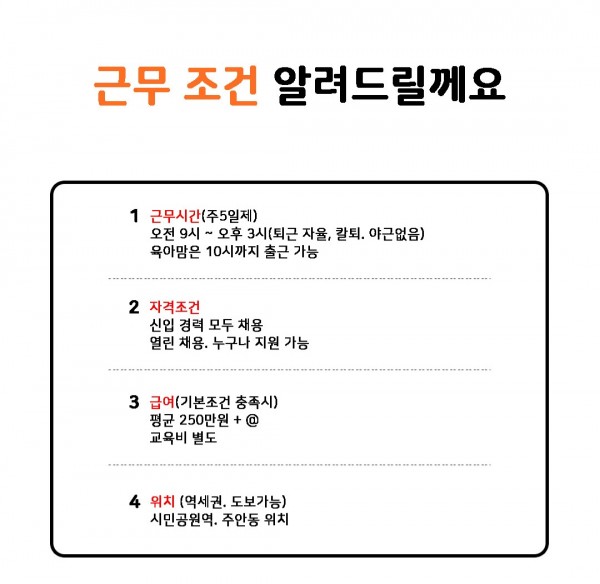 ◇ 근무조건 : 9시 30분~15시 주5일 공휴 쉽니다.